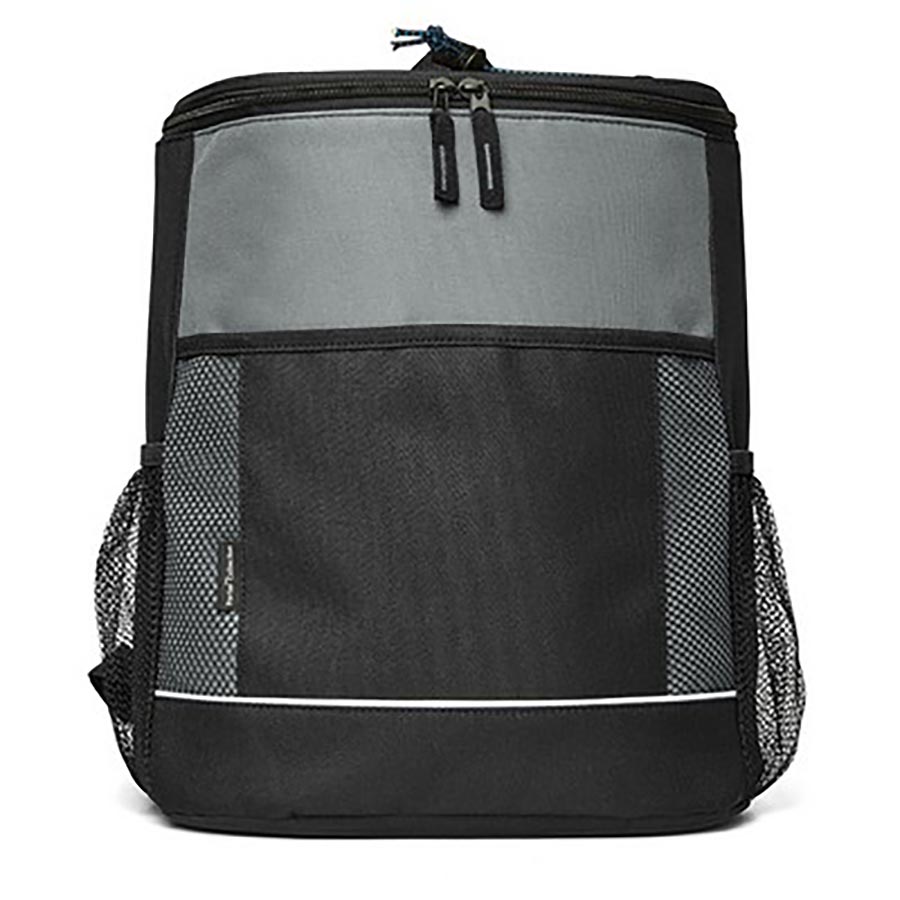 600D Polyester with 6mm EPE foam with PEVA lining. Large zipper main compartment, front open pocket, 2 side mesh pockets and padded shoulder straps. Holds 18 cans of your favorite soda. Front open pocket and an elastic bungee on top panel can also be used for storing last minute items. Hand wash only, do not iron. Production time may vary due to imprint method. Complies with Prop 65. 10.75" W x 12.75" H x 7.25" D